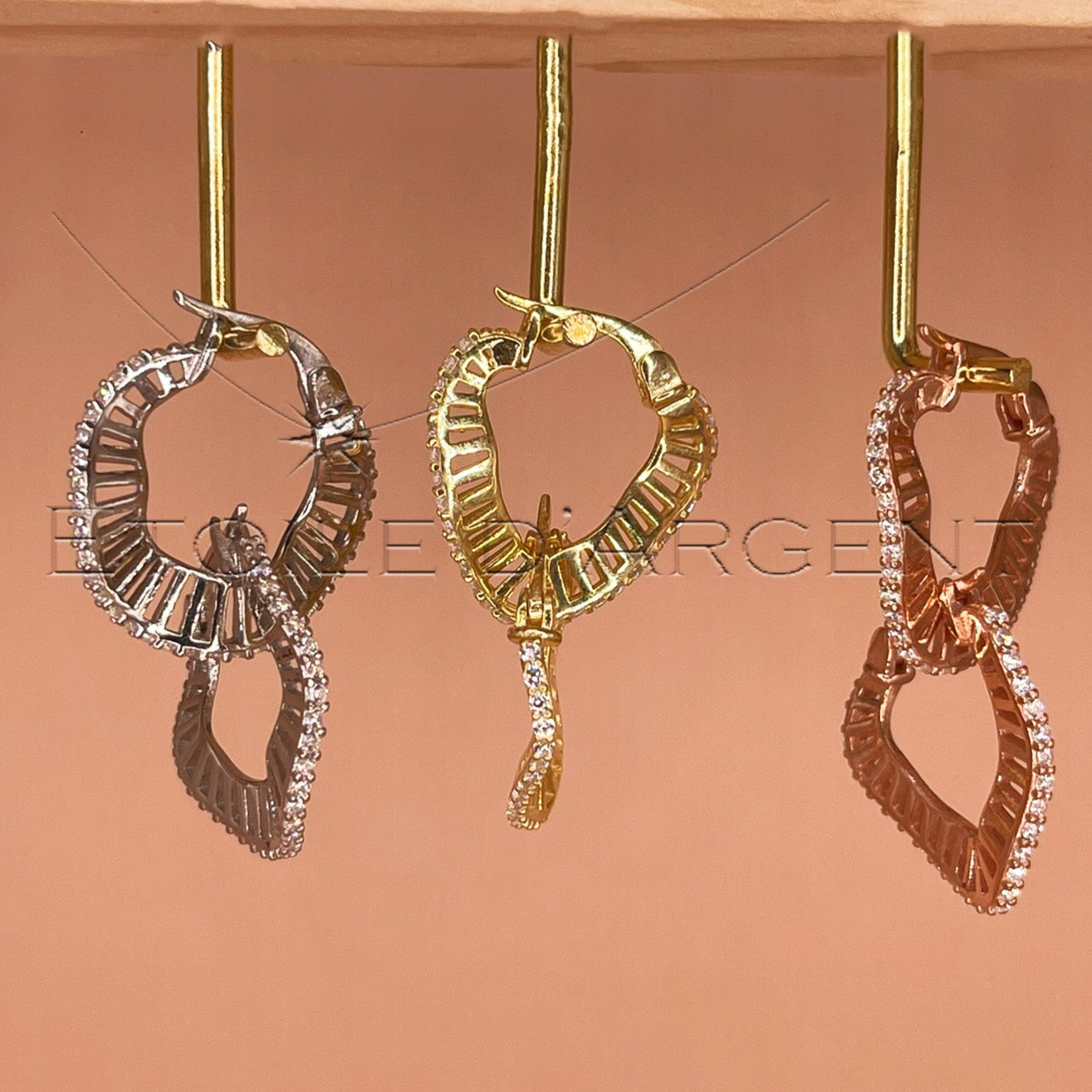 Découvrez l'originalité et l'éclat de ces boucles d'oreilles Étoile d'Argent. Confectionnées en argent 925 et plaquées or, elles présentent un design unique en forme de nœuds torsadés, rehaussés de petites pierres scintillantes. Ces nœuds dorés apportent une touche d'audace et d'élégance à votre look. Un bijou parfait pour celles qui aiment se démarquer avec style. Avec un diamètre de 2 cm.