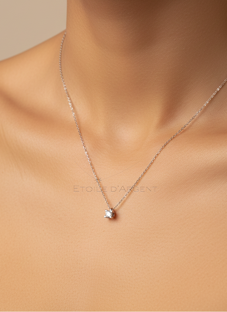 Affirmez votre style avec ce pendentif Étoile d'Argent au minimalisme étincelant. La chaîne en argent délicate et le pendentif de forme carrée arrondie, orné d'une pierre blanche d'une luminosité douce, créent un équilibre parfait entre simplicité et raffinement. Tel un symbole de pureté