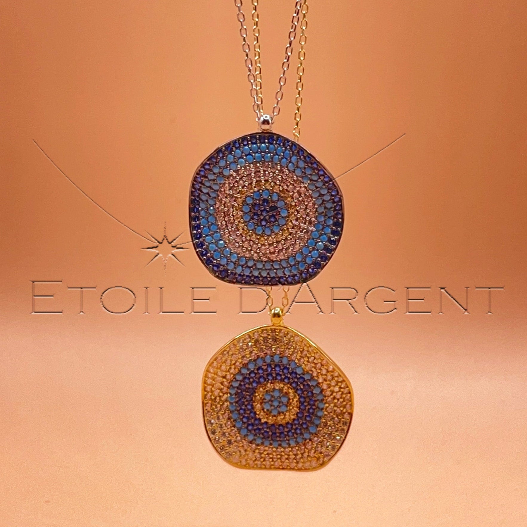 Découvrez le regard protecteur de ce pendentif Étoile d'Argent. Ce collier unique est confectionné avec une chaîne en argent et un pendentif rond, orné d'une mosaïque de pierres bleues aux couleurs profondes et scintillantes. Chaque pierre est soigneusement sélectionnée et placée pour créer un effet visuel captivant. Un bijou d'exception,